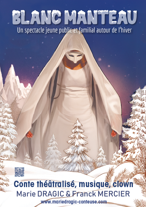Blanc manteau est un spectacle conté et musical sur le thème de l’hiver. Dans un décor immaculé et monochrome, à travers milles artifices, l’hiver montre ses mille visages. Dans le calme blanc d’une forêt enneigée, dans le sifflement du vent, dans les sensations froides, l’hiver se regarde, s’écoute, se chante, se danse, se joue et même se mange ! Tous les sens sont mis en éveil pour apprivoiser ce Bonhomme Hiver qui se fait de plus en plus rare.
